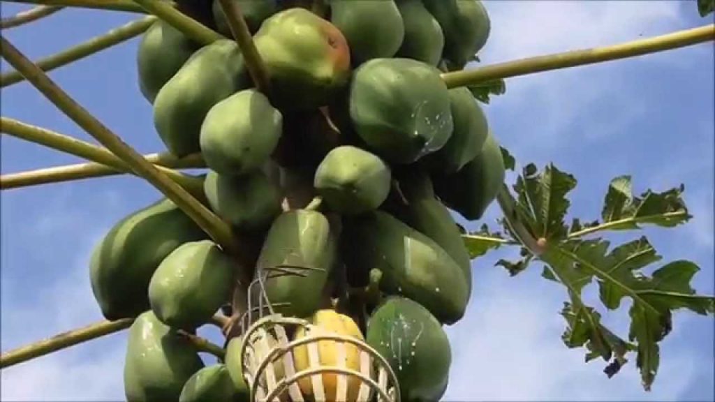 Papayas are delicious low-cal, sweet-tasting fruits. Their skin ranges in color from green to a lovely yellow; you know when they’re ready when their hue fades to about 80% yellow …