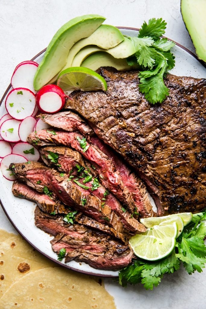 This recipe calls for marinating skirt steak or flank steak in a delicious blend of olive oil, soy sauce, lime juice, vinegar, sugar, and spices. For additional flavor, minced garlic, jalapeo peppers, and cilantro are added for extra texture.